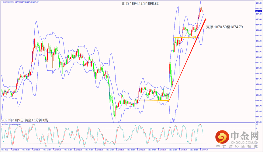 日级别线图,长阳烛收复前日跌势,守住1870.00关口,可能持续上涨;15分钟K线,短线形成盘涨,守稳上升趋势线,有机会挑战上方阻力。