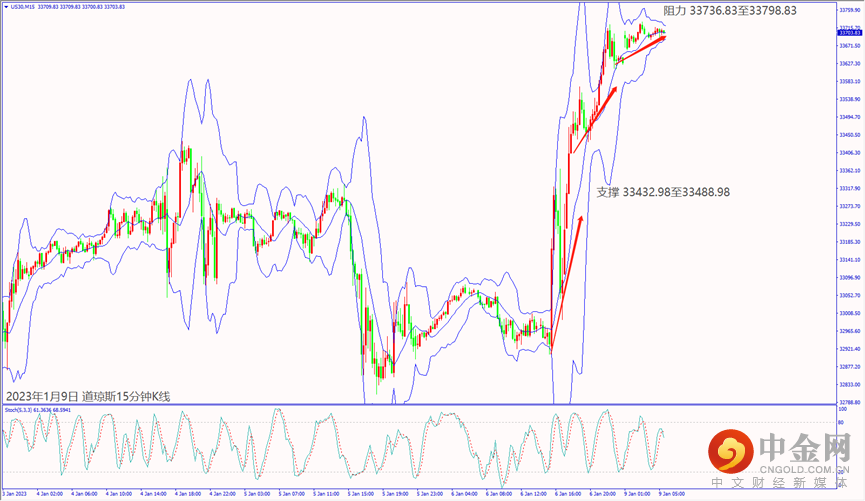 上周五(6日)美国公布非农数据好于市场预期,利好道琼斯和纳指皆涨逾2%。预期今天(9日)欧元区公布经济数据大都利好,德指若守住小时布林带中轨14,603,建议可短多操作。预期今天美联储官员重申加息抑制通胀,道琼斯一旦跌破小时布林带中轨33,628,建议可短空操作。