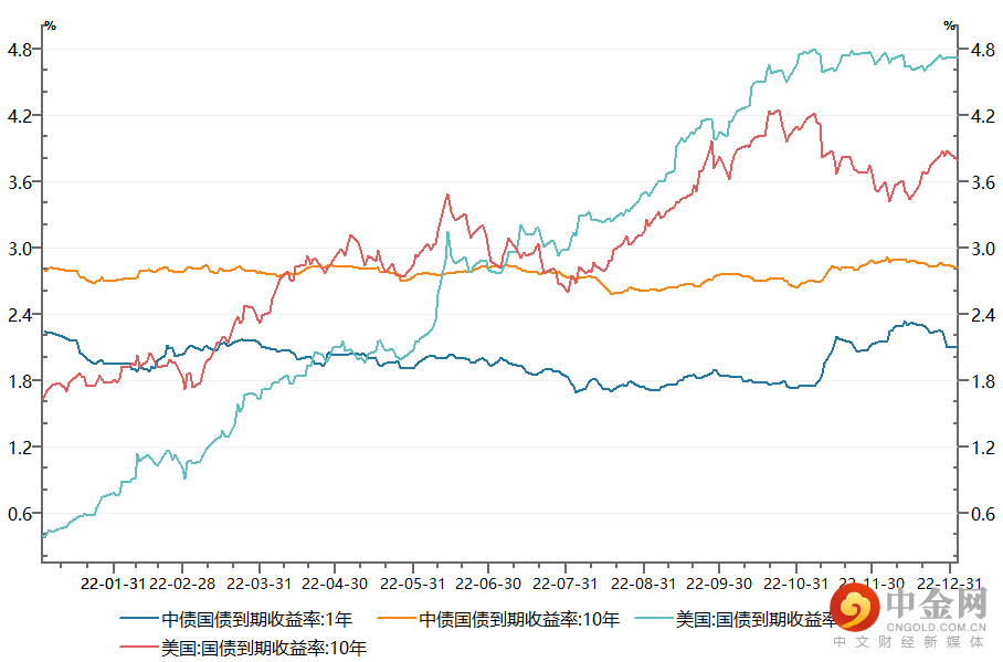 以中美1年、10年期国债收益率水平变化,反映债券资产所处的利率环境。