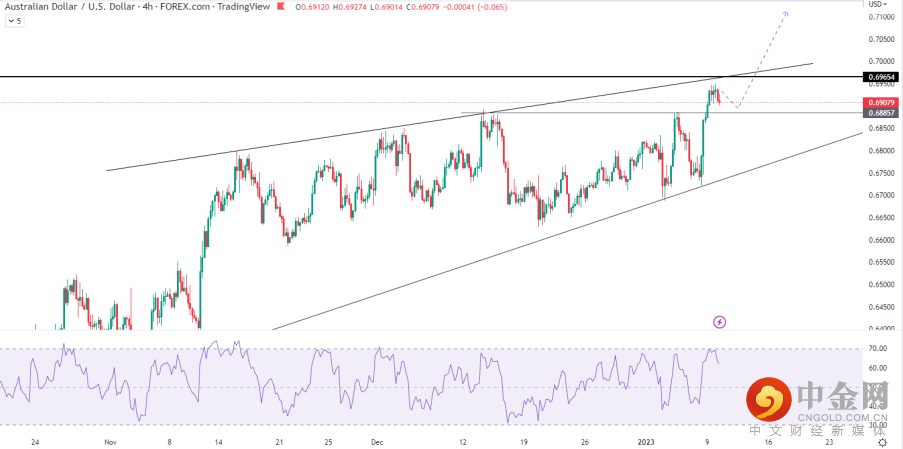 但目前澳元在接近通道上轨0.6965附近遇到一定的阻力,短线有回调的需求,但只要美元持续弱势,调整幅度预计有限。再次突破上述阻力后有望挑战前高0.7136。
