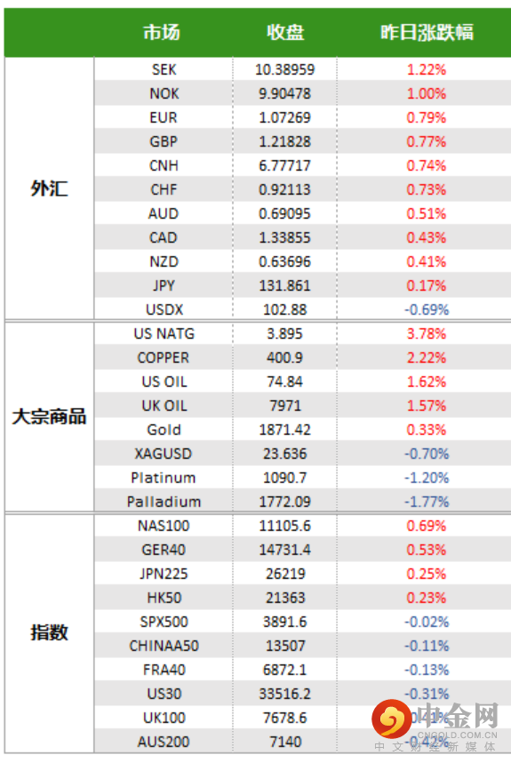 美元指数刷新6个月新低,黄金延续良好上涨势头站上1870关口。原油在回吐日内涨幅后收盘上涨1%左右。