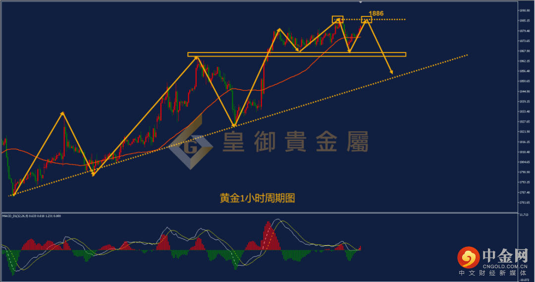 从黄金1小时周期图来看,黄金前期沿着上升趋势线走出高低点同步上移的多头趋势。昨日黄金再度创出新高,但可以看出,本次上涨力度较前期有所转弱,意味着多头动能逐渐衰竭,短线再度冲高可以尝试轻仓布局空单。目前MACD指标也出现了顶背离的信号,后期黄金继续上涨难度较大。短线投资者可以关注昨天欧盘高点1886附近尝试布局,预计冲高此压力位后将受阻回落,建议投资者尝试在此位置布局空单。