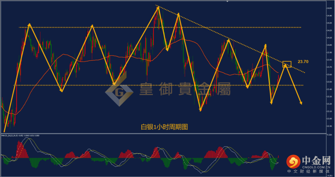 从下方白银1小时周期图看,白银前期围绕震荡区间震荡运行,震荡区间在23.50-24.20之间,但近期白银整体重心不断下移,逐渐向下轨支撑靠拢,表现弱势。目前MACD双线指标也回落至零轴下方,即便后期反弹也是弱反弹。本轮MACD双线金叉,短线将迎来反弹,反弹后可以关注下跌趋势线的压力位23.70附近,此位置与昨日高点相近,有抛压。建议投资者尝试在此位置布局空单。