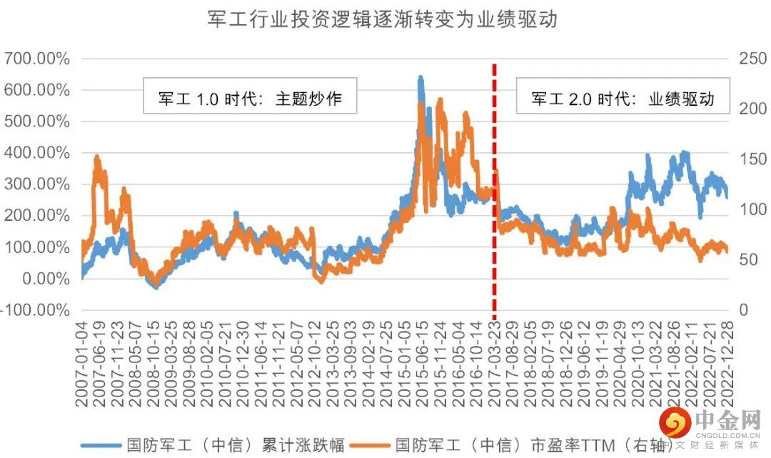 2007年-2016年,那一阶段军工的主线投资逻辑是主题炒作,军工企业核心资产大多未上市,上市公司自身价值较低,其股价走势也往往是估值推升。