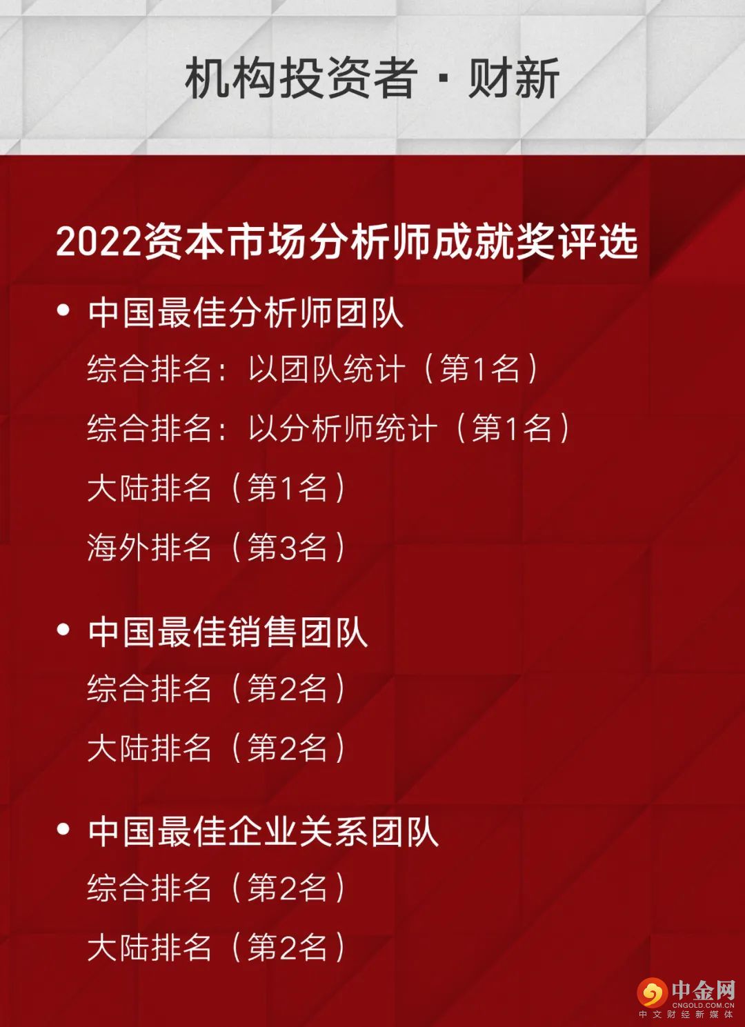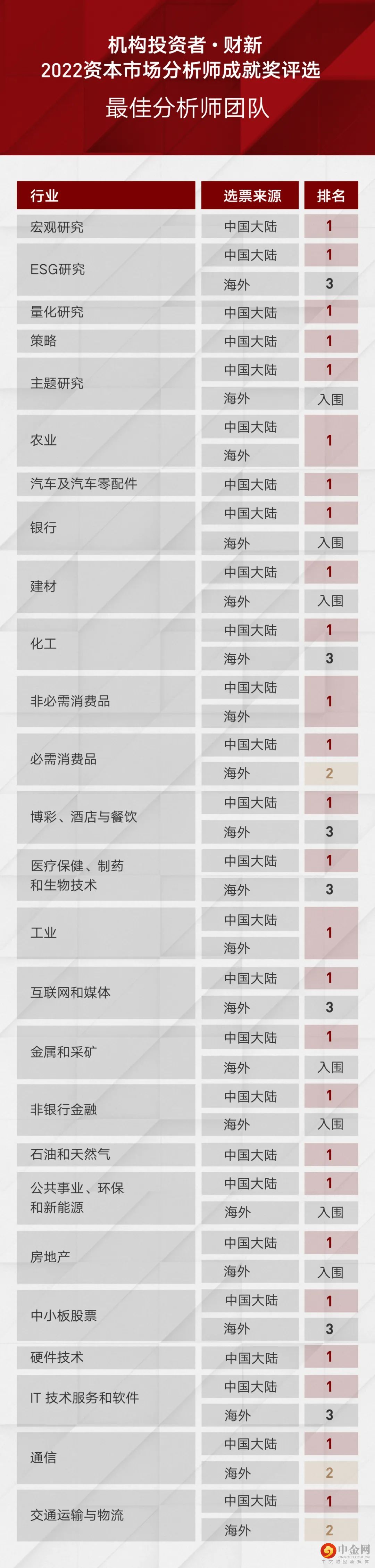 中金本届评选具体所获奖项情况如下: