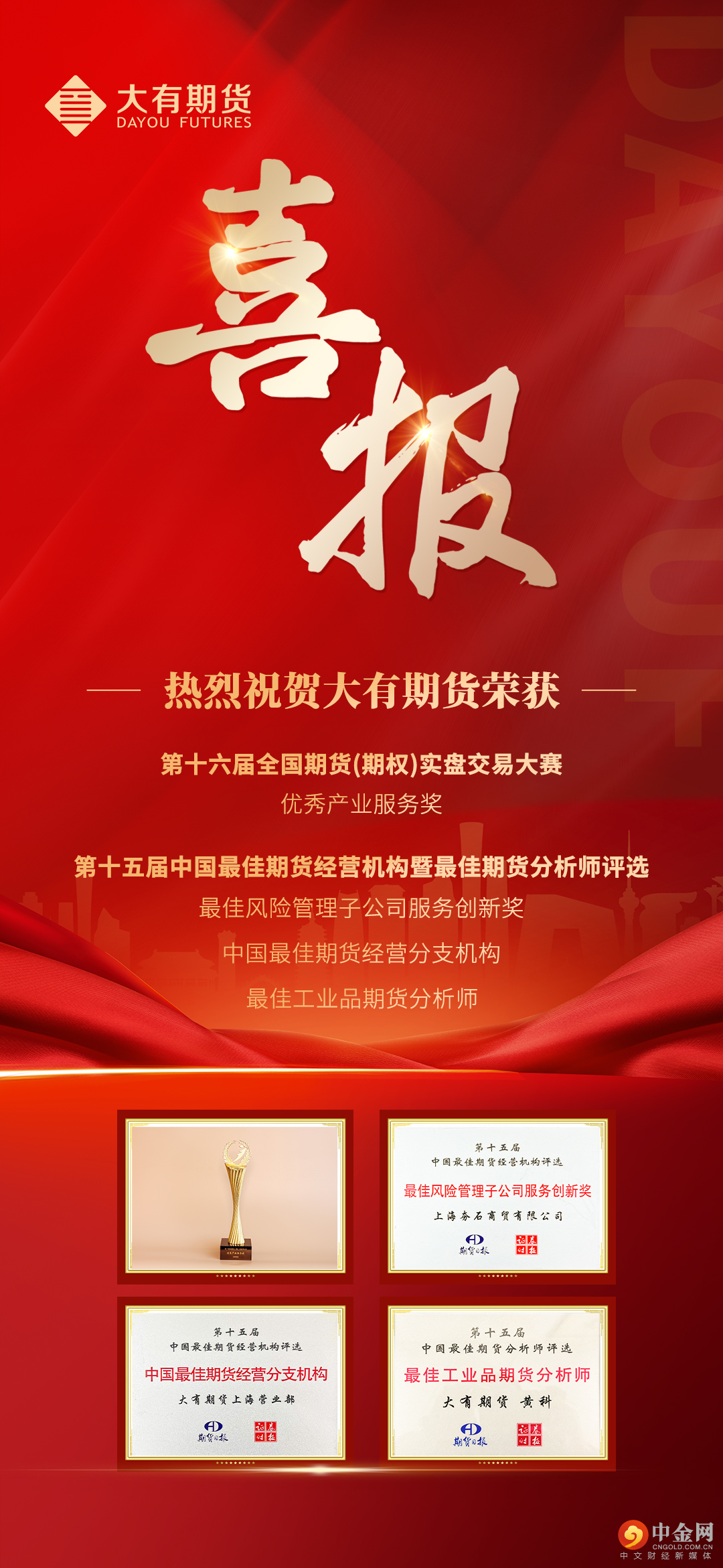 近日,大有期货在由期货日报、证券时报主办的第十六届全国期货(期权)实盘交易大赛中荣获“优秀产业服务奖”,并在第十五届中国最佳期货经营机构暨最佳期货分析师评选中荣获“最佳风险管理子公司服务创新奖”“中国最佳期货经营分支机构”“最佳工业品期货分析师”。