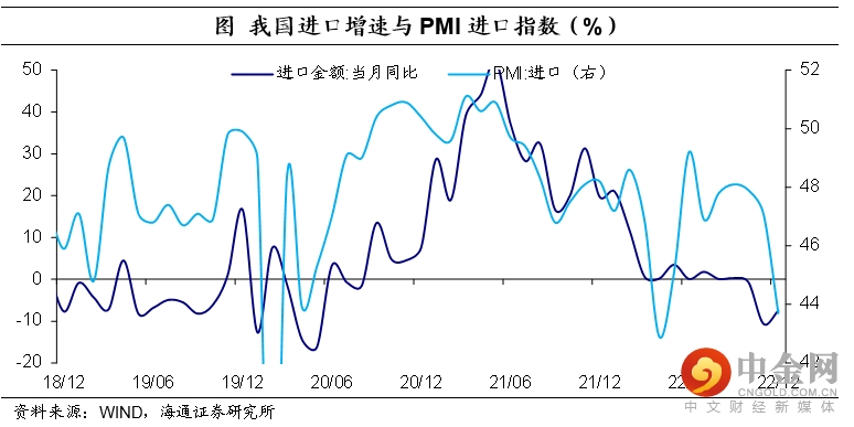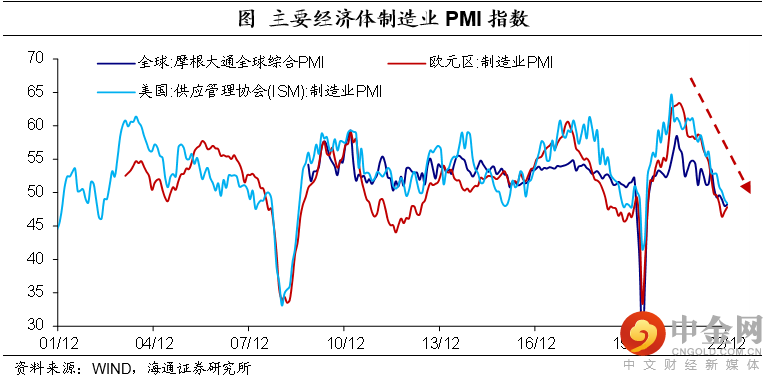 具体来看,出口跌幅扩大,仍与外需降温有关。美元计价下,2022年12月我国出口金额同比增速下降至-9.9%,较上一月继续回落1个百分点。这仍然与全球需求持续走弱有关。例如,12月摩根大通全球综合PMI指数为48.2,连续5个月居于枯荣线以下,欧美等主要经济体PMI指数也持续数月居于枯荣线以下。