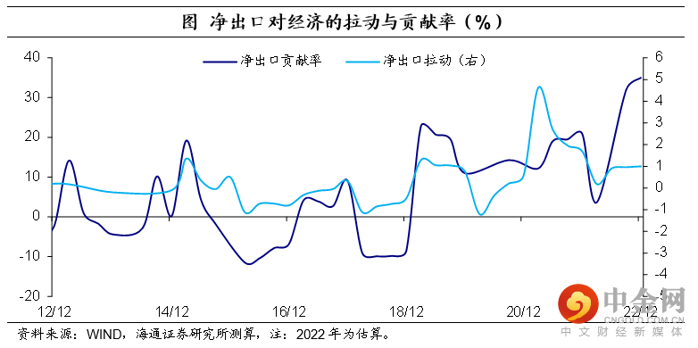 在此基础上,我们根据投入产出表测算,预计2022年全年“净出口”对实际经济增长的拉动或仍有约1个百分点,对实际经济增长的贡献率或在30%以上。