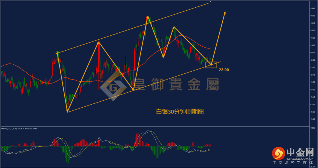 从下方白银30分钟周期图看,白银短线沿着上升通道震荡上行,短线回落至上升通道下轨附近寻找支撑。目前MACD指标于0轴下方形成金叉,红色动能柱有望进一步放大,短线在通道下轨得到支持并反弹的概率加大。短线可以关注通道下轨支撑23.90附近,此位置也是前期箱体整理区间的中轴支撑位,预计在此受到支撑并反弹的概率较大,建议尝试在此位置布局多单。