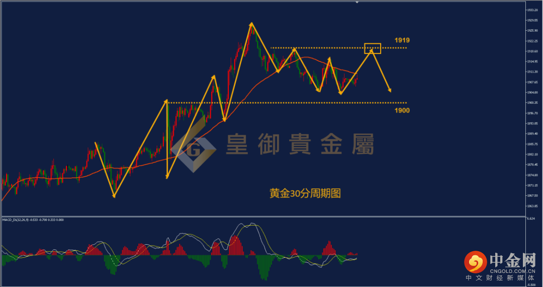 从黄金30分钟周期图来看,黄金前期沿着60日均线走出高低点同步上移的多头趋势,近期上升趋势已经被打破,短线受到60日均线压制逐渐下移。当前MACD指标于0轴下方形成金叉,红色动能住也有放大的可能,短线黄金或将打破均线压制向上反弹,但反弹也只是弱反弹,还是以震荡来观察。如果反弹可以关注近期高点压力位1919附近,此压力位多次突破未果,短线对价格形成压制的可能性较大。建议尝试在1919附近布局空单。