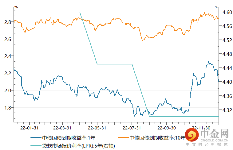 下图展示了1年期、10年期国债收益率和LPR(5年期)在2022年内的变化情况。