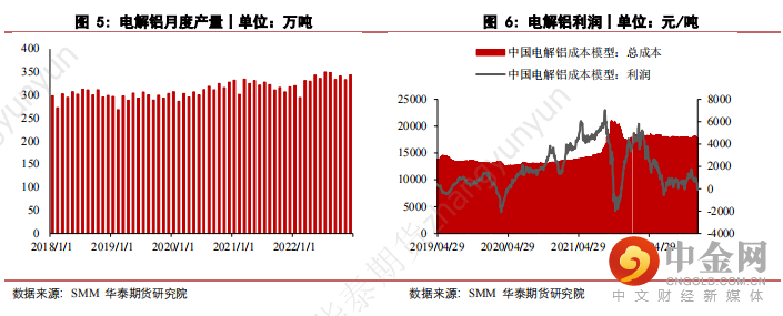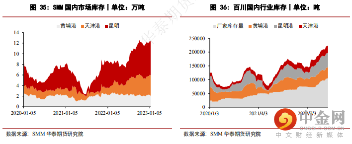 供应方面,2022年12月电解铝产量343万吨,2023年1月份预计产量332万吨,春节前后两个月的产量累计约675万吨,虽然近期贵州地区三轮减产导致电解铝运行产能进一步下滑,但整体产量较往年相比有所抬升。而在全面放开政策下工人返乡意愿较浓,预计需求恢复较慢,因此2023年春节前后累库幅度或在40-50万吨,节后库存高点接近百万吨上下。