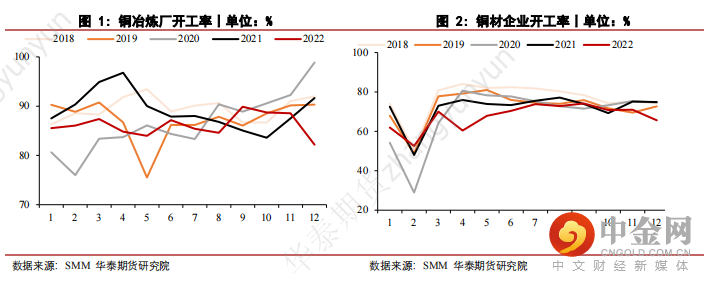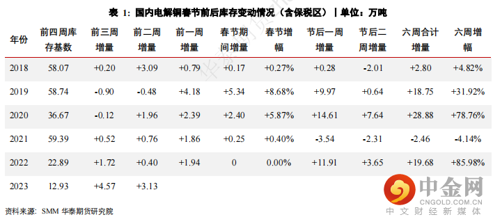 通常而言,国内铜冶炼春节期间,除去有检修安排的企业外,大多会维持正常生产,尤其在冶炼利润尚可的情况下,更是如此。除去2020年因疫情来袭而导致的炼厂开工率大幅下降,近五年中其余年份开工率均维持在85%以上。而在需求方面,初级加工端企业春节放假的情况相对更多,而终端板块由于涉及行业较多,春节期间休假的情况更为寻常。因此每当春节前后,国内电解铜库存大多呈现出明显的累高。在过往五年中,除去2021年下游需求由于从2020年疫情冲击后呈现报复性反弹致使春节前后6周累计出现去库的情况,其余年份都发生了累库的现象。
