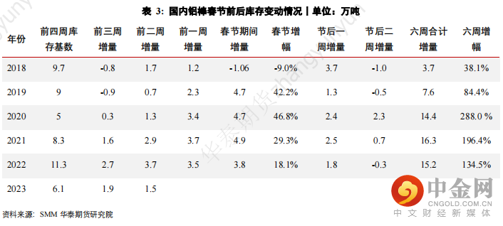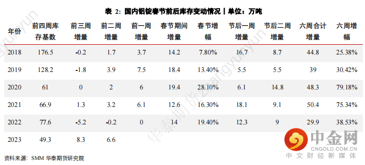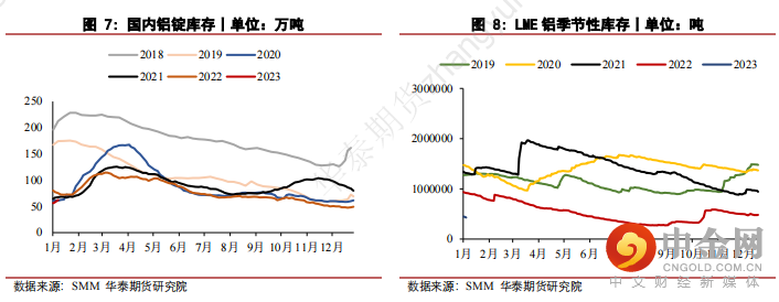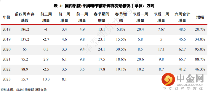 由于电解铝自身连续生产的特殊性,春节期间铝冶炼企业处于一直生产的状态,供应平稳释放,而一季度是传统消费淡季,叠加春节期间下游铝板带箔、型材等加工企业普遍放假2周左右,对电解铝的需求下降,供需产生季节性错配,使得国内电解铝在春节前后累库特征较为明显。