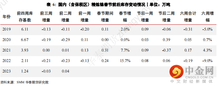 由于中国精炼镍供应有一半以上来自于进口,春节期间精炼镍处于供需两淡状态,供应和需求同步下降,而且近几年中国精炼镍处于持续去库状态,因此近几年春节期间精炼镍累库并不明显。