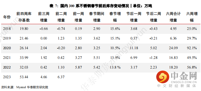 根据Mysteel过往数据统计,从累库时间节奏上来看,国内300系不锈钢在春节前后六周内基本都处于累库状态,仅少数时间会有小幅度下降,春节前后300系不锈钢整体库存水平皆增幅明显。2018年300系不锈钢社会库存从春节前一周开始累库,六周整体累库幅度为25%。2019年300系不锈钢社会库存在春节前持续累库,春节后第二周库存出现小幅下降,但后面再次累库,六周整体累库幅度为29.7%。2020年受疫情冲击影响,300系不锈钢消费低迷,春节前后六周时间整体累库幅度高达92.1%。2021年300系不锈钢社会库存春节累库节奏与2019年类似,在春节前持续累库,春节后第二周库存出现小幅下降,但后面再次累库,六周整体累库幅度为49.5%。2022年300系不锈钢社会库存在春节前后六周时间内全部处于累库状态,六周整体累库幅度为56.8%。