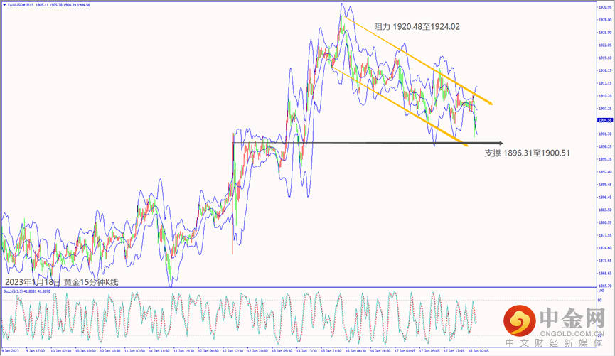 昨天(17日)欧洲央行考虑在2月加息后放缓利淡欧元和利好美元,造成黄金价格反转跌约15美元。预期今天(18日)美国公布PPI下降利淡美元,黄金价格若守住1900.00关口,建议可短多操作。