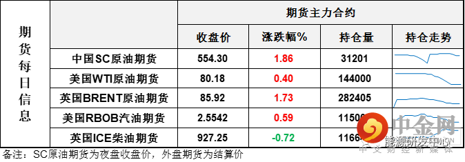 【1】WTI主力原油期货收涨0.32美元,涨幅0.4%,报80.18美元/桶;布伦特主力原油期货收涨1.46美元,涨幅1.73%,报85.92美元/桶;INE原油期货收涨1.86%,报554.3元。
