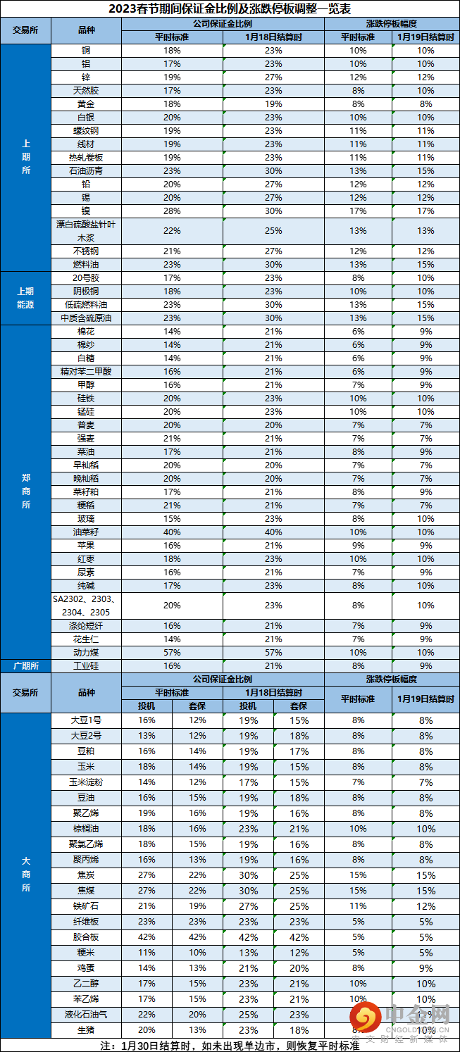 二、为有效防范节后国内期货市场可能产生的市场风险,公司根据各期货交易所文件通知,经研究决定,于2023年1月18日(星期三)结算时起,对春节期间相关品种公司交易保证金比例进行调整,具体内容如下表。