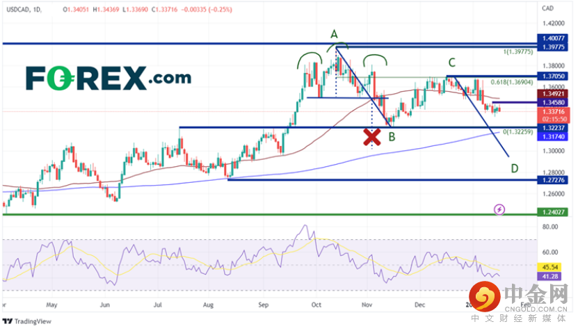 美元/加元自2022年以来缓步上涨,并在去年9月15日突破阻力位1.3223。随后,货币对快速上跳至2022年高点,在10月13日上探1.3976。货币对由此形成头肩形态,但未能成功突破实现目标。美元/加元从2022年10月13日高点反弹至61.8%斐波那契回档位,触及前支撑位1.3690,形成目前的AB=CD形态。而该形态目标接近1.2950点。