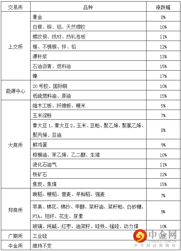 二、1月19日(星期四)结算时起,交易所将对部分合约涨跌停板幅度限制进行调整。具体调整如下:
