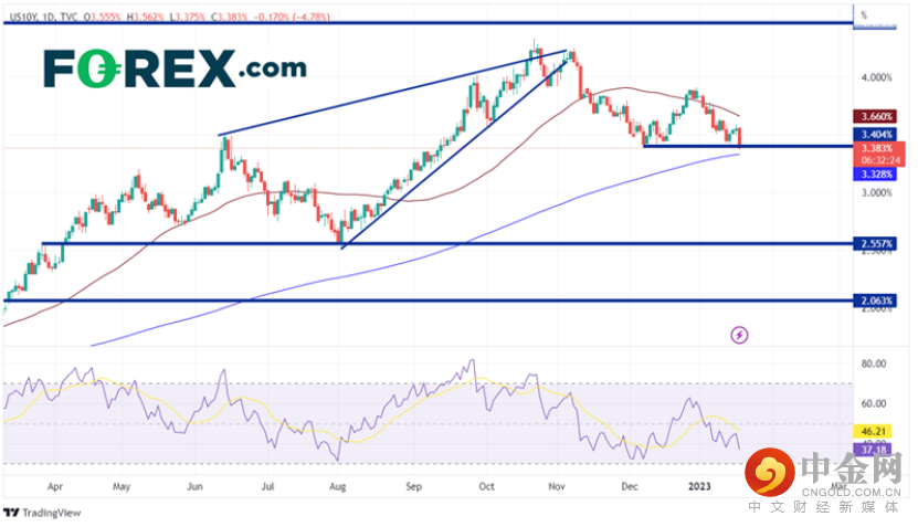 疲软的零售销售、通胀和制造业数据表明,美联储在2月1日的会议上将更加鸽派。这正在推动利率和美元走低。美国10年期国债收益率跌至2022年9月中旬以来的最低水平3.375%,而DXY收于2022年5月30日的支撑位101.30。
