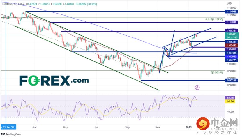 今天早些时候公布了日本央行政策和英国通胀,这时候最好看看欧元/美元,因为欧元区与它们没有太大的利害关系。在日线图上,欧元/美元触及2022年4月21日以来的最高点,美元的疲软助推该货币对走高。价格目前正在测试该通道的顶部趋势线1.0865附近,该趋势线始于2022年11月。如果美元继续走弱,该货币对将延续涨势。第一阻力位于4月21日的高点1.0936。在此之上,欧元/美元可能会移动到2022年3月31日的高点1.1185,然后是从2021年5月高点到2022年9月低点区间的61.8%斐波那契回撤位1.1329。但是,如果欧元/美元回调,第一支撑位是1月4日以来的高点1.0635。在此之下,价格可能测试50日移动平均线和通道底部趋势线的复合支撑位1.0548附近。下一支撑位是1月6日的低点1.0482。