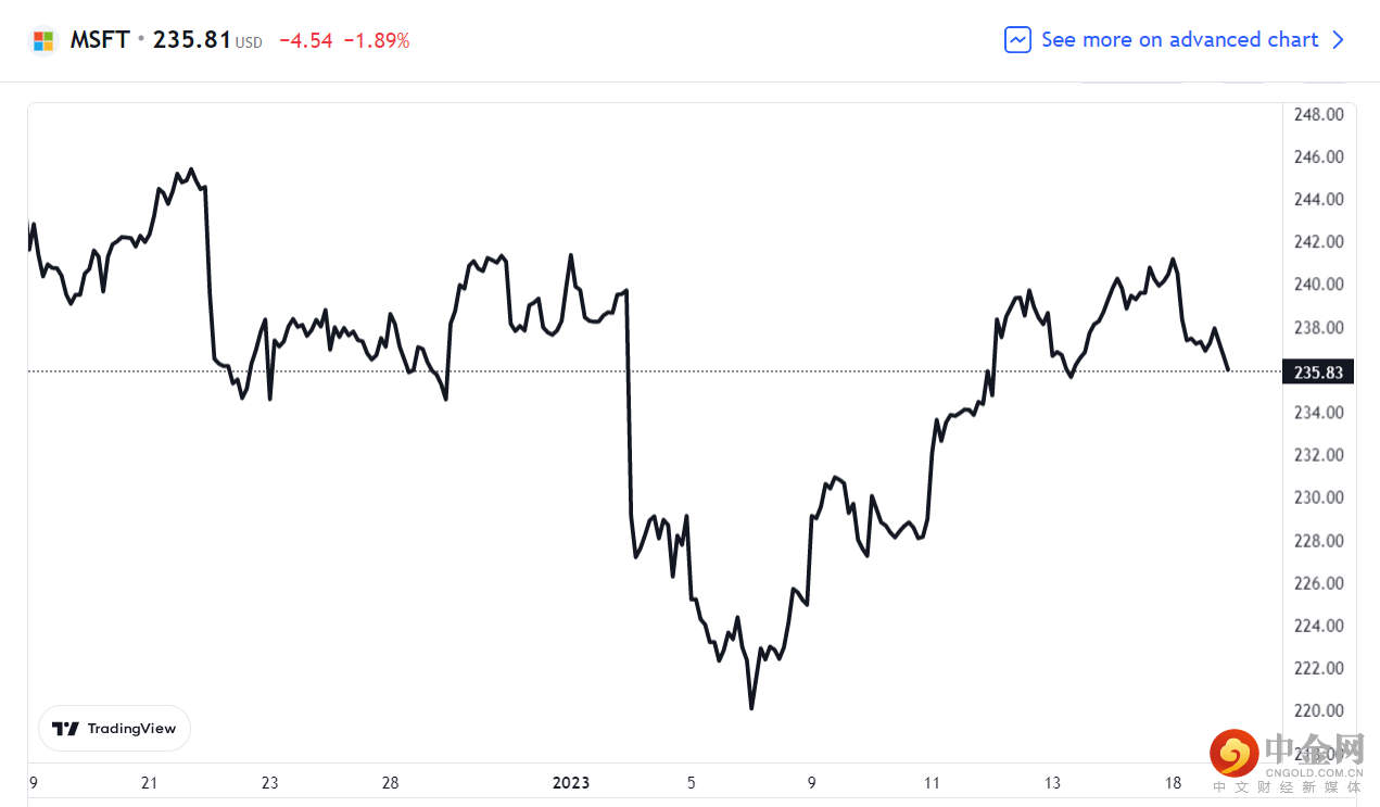 消息公布后,微软股价在美股收跌 1.89%,报 235.81 美元。