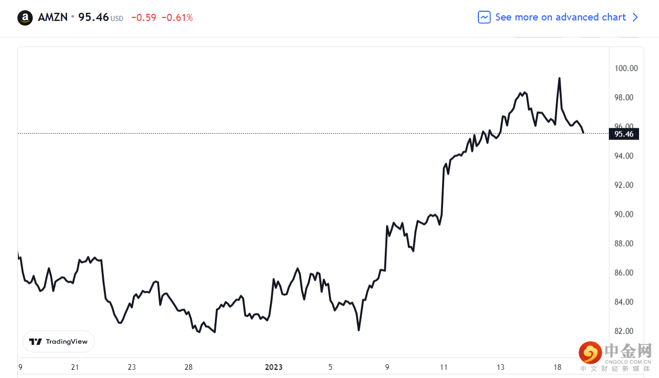 1 月 18 日亚马逊股价同样收跌,报 95.46 美元,日内微跌 0.61%。