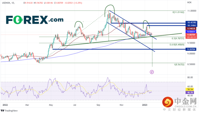 从2022年3月31日到2022年9月28日,美元/挪威克朗一直大幅走高,最高达到11.0116。此后,价格在通道中稳步走低,直到12月在9.7876附近的支撑位止跌。该支撑位由200日移动平均线、通道的底部趋势线以及从2022年6月初的低点形成的上行趋势线共同构成。通常情况下,当价格未能跌破通道的一侧时,它会移向另一侧进行测试。1月3日,价格向上突破通道上沿9.9987附近。然而,三天后,价格创下10.3106的高点并反转。美元/挪威克朗目前在50日移动平均线、200日移动平均线、通道顶部趋势线、自2022年6月以来形成的长期上行趋势线以及从3月31日低点到9月28日高点区间的50%回撤位9.8900附近盘整。
