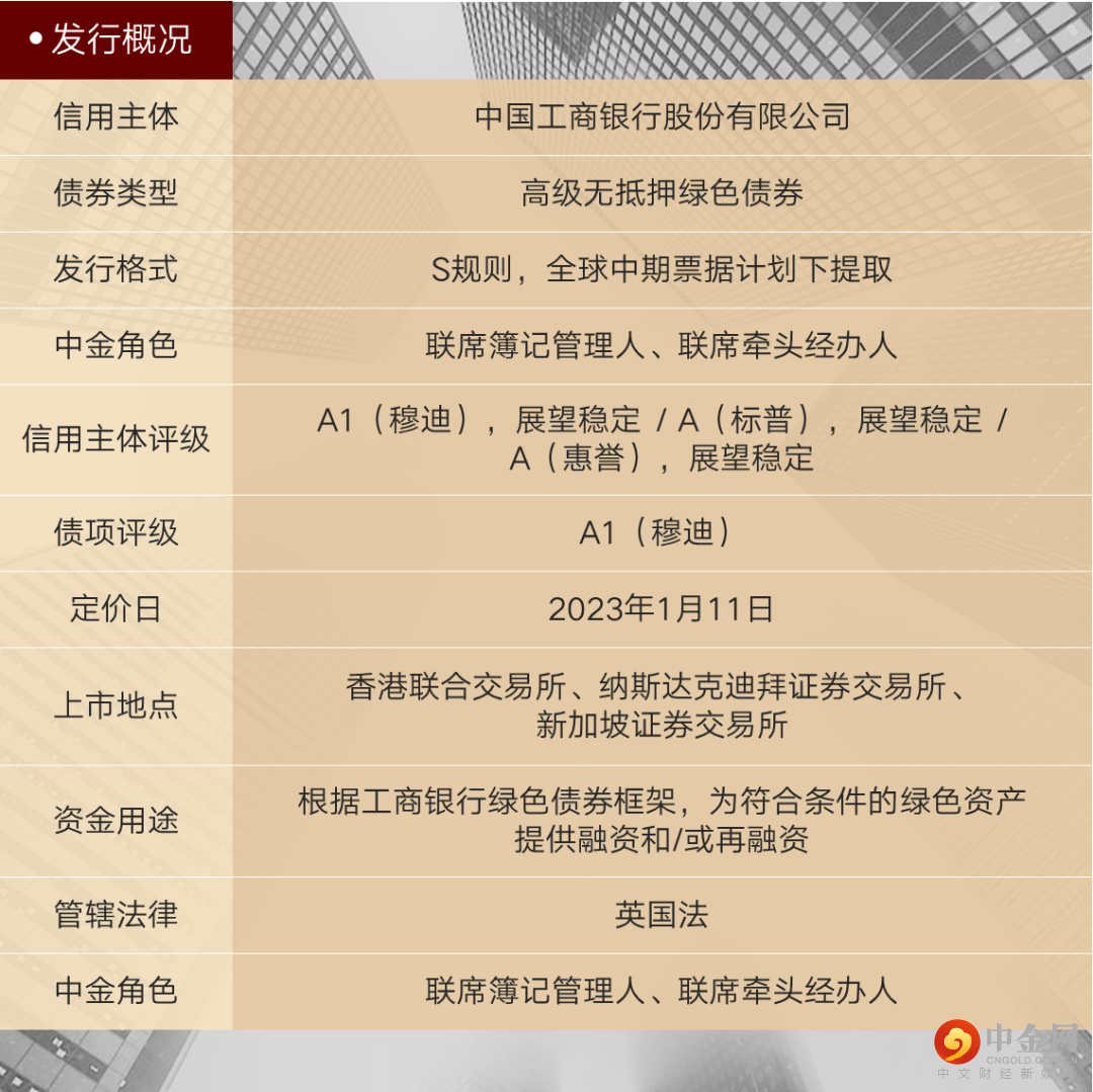 2023年1月11日,中国工商银行股份有限公司(“工商银行”或“公司”,穆迪A1/标普A/惠誉A)境外多家分行成功发行全球多币种“碳中和”主题境外绿色债券(“本次发行”),债项评级均为穆迪A1。中金公司参与了香港分行、迪拜分行及新加坡分行的发行,并在其中担任联席簿记管理人、联席牵头经办人角色。