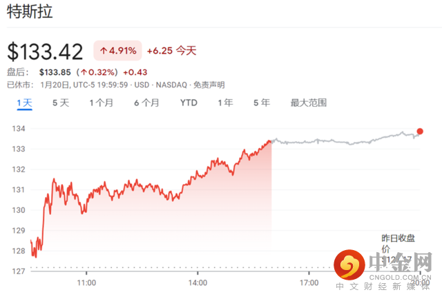 隔夜美股收盘,特斯拉股价大涨近5%至133.42美元/股。