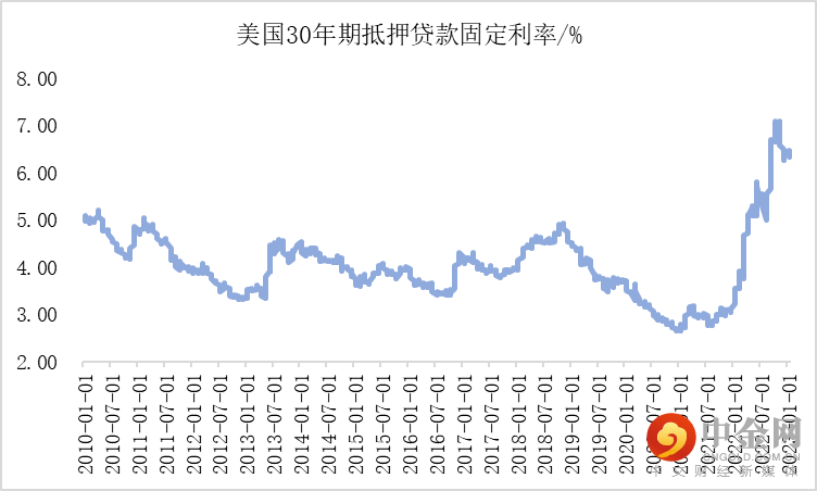 在联邦基金利率上升的同时,2022年开始,美国30年期抵押贷款固定利率整体也呈现上升的趋势。2022年10月至今,该指标均保持在6%以上,2022年10月27日达到7.08%,为2002年5月以来的最高值。