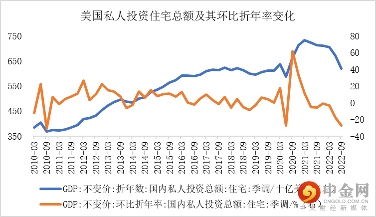 2021年3月,美国私人投资住宅总额达到高值7320.21亿美元,其后便开始一直下降至2022年9月的6199.81亿美元,其季调环比折年率也从2020年9月的高位值61.60%下跌至2022年9月的-27.10%。