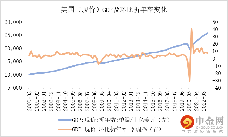 从美国现价GDP(现价:用当时价格来计算的国内生产总值)来看,该折年季调数值在2020年3月后出现了较大幅度的下跌(折年:将目前已公布的季度GDP数据折算成全年预测数据;季调:根据历史数据的季节波动规律,把季节波动抹平后得到的数据)。