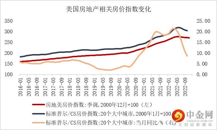 依旧从已有的房地美房价指数、标准普尔/CS房价指数(20个大中城市)来看,与往年一直持续增长的趋势明显不同,该两指数在2022年7月至10月都出现了持续下跌的现象。