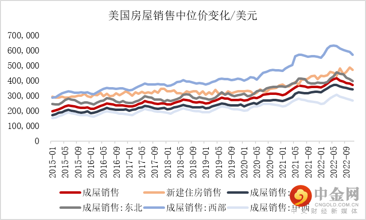 而从美国成屋销售的中位价变化来看,虽然一段时间以来整体仍呈现上涨的趋势,但2022年下半年,美国成屋销售的中位价仍出现了较为明显的下跌,南部、中西部、西部、东北部地区也一样。