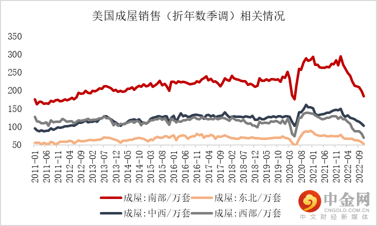 整体而言,无论从南部还是中西部、西部、东北部,美国的房屋销售数量都出现了较大幅度的波动下跌。