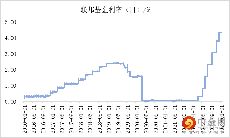 相应地,美国每日联邦基金利率也从2020-2021年的基本0.1%以下逐步增到2022年12月末以来的4.33%。