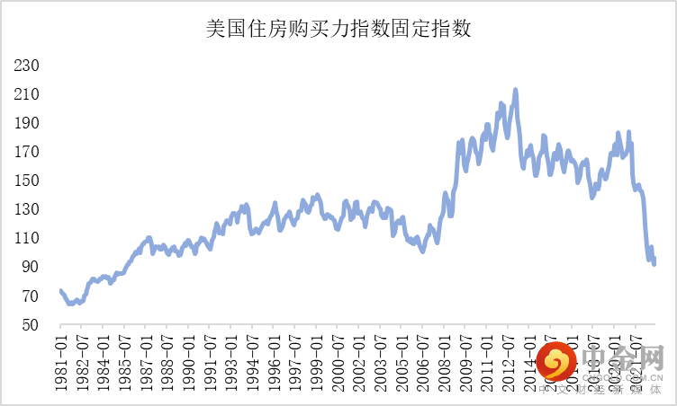 实际上,作为测量国民家庭购买住宅的财务能力的一个指标,从美国住房购买力指数来看,2022年11月,美国的住房购买力指数(固定指数)已经降到了95.5。