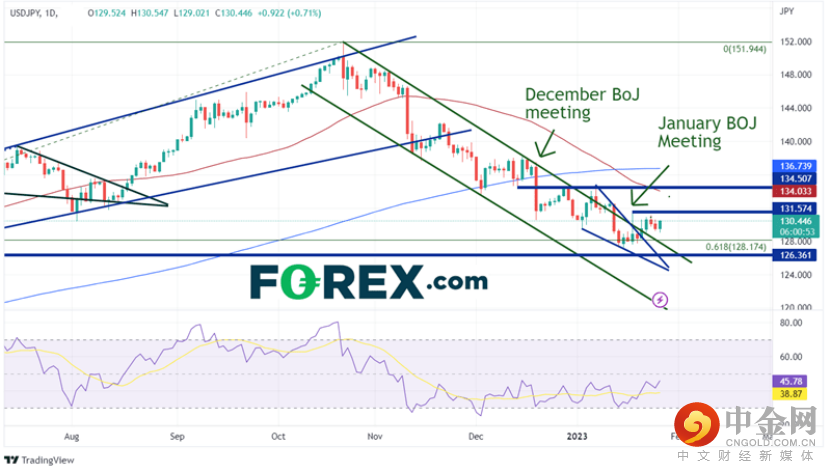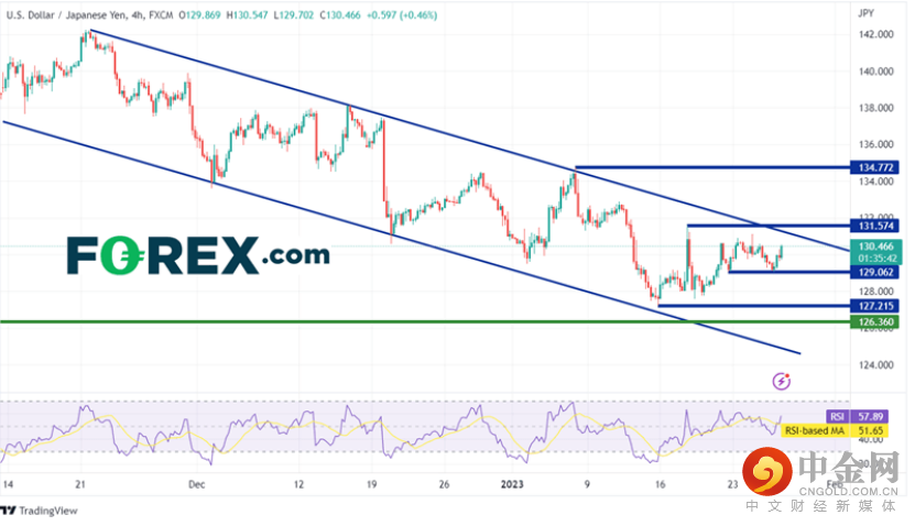 美元/日元自2022年10月21日创下2022年高点以来,一直在通道中稳步走低。该货币对跌至2022年低点到2022年高点区间的61.8%斐波那契回撤位128.17附近。2023年初,美元/日元开始在通道内形成下降楔形。该货币对在1月18日日本央行会议后开始横向冲破楔形和通道。自会议以来,价格一直在127.56和131.57之间振荡。