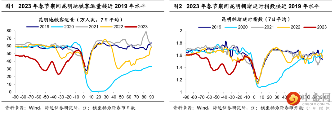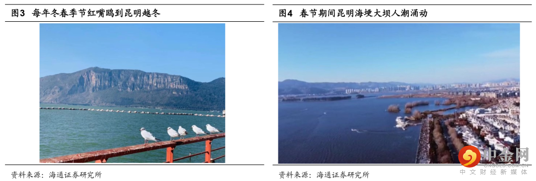 旅游、出行活力重现。正是由于四季温暖如春的气候,每年冬天总会有成千上万只红嘴鸥从遥远的西伯利亚飞至昆明越冬,成为了昆明的一张亮丽名片。随着防疫政策的优化以及各地疫情陆续达峰,今年昆明假日旅游异常火热,各大公园的旅游接待热度很高。今年我家门口的地铁已经开通,乘坐地铁前往赏鸥地海埂大坝的路上可以发现人流量已在逐渐恢复,海埂大坝更是人潮涌动,连附近双向十车道的主干道都堵得水泄不通。此外,云南是一个多民族的边疆省份,全国55个少数民族中有15个少数民族为云南所特有,截至2021年末少数民族人口占到全省总人口的33%。而位于昆明海埂大坝附近的云南民族村景区正是展示各少数民族特色文化的集中地,吸引了各地游客的关注。根据昆明发布公众号和最昆明公众号,今年春节期间云南民族村景区游客接待量达到7.86万人次,恢复至2019年同期68.9%的水平。众多游客的涌入也可从城市拥堵和地铁客运数据中窥见端倪:从城市客运数据来看,春节假期期间昆明地铁客运量、拥堵延时指数已经接近甚至超过2019年时的水平。总体上看,今年春节假期昆明旅游迎来强劲复苏:全市接待游客911.34万人次、实现旅游综合收入62.45亿元,分别恢复至2019年同期水平的89.8%、96.9%。