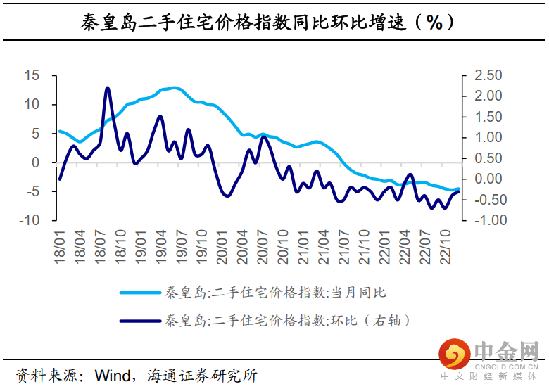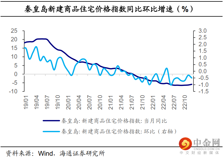 秦皇岛新建商品住宅价格指数、二手住宅价格指数分别在21年6月、20年12月起就开始整体环比负增,传递楼市偏冷信号。22年4月,家乡房产交易服务中心公告“购买存量房(二手房)的购房人申请购房资格核验时只提供本人有效身份证件”,6月再度出台“实施商业性个人住房贷款首套20%、二套30%的最低首付比例政策”,但未能对价格的下行态势造成明显影响。此外,近几年已经很少看到家乡有新建的楼盘。据安居客网站显示,截至1月25日,海港主城区待售楼盘仅有8处,全部在售新房楼盘共有28处。