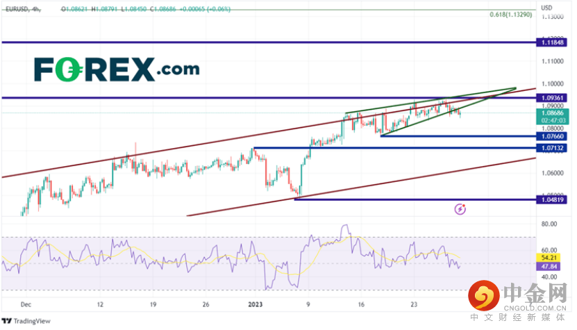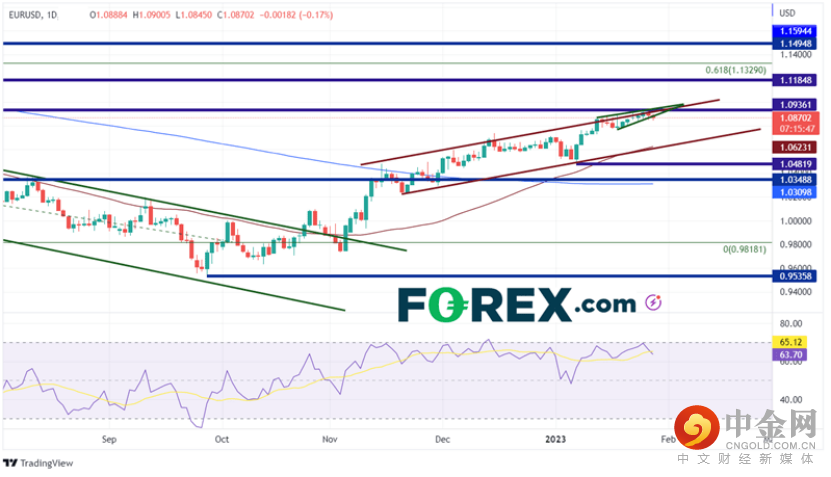 由于数据全都在意料之中,美元在数据公布后几乎没有动作。正如我们在之前的文章中所讨论的,欧元/美元在2022年9月28日触底0.9536后,持续走高。11月中旬,该货币对开始在狭窄的上行通道内移动,保持在50日移动平均线和水平阻力位1.0350上方。该货币对目前在通道的顶部趋势线附近振荡,并形成上升楔形,因为欧元/美元遇到了2022年4月21日的高点1.0936附近的水平阻力位。