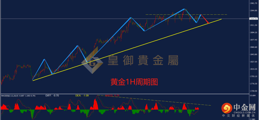 从下图的黄金1H周期图来看,黄金于此前进行延续上涨,走出高低点逐渐上移的上涨趋势并构建上涨趋势线,行情沿趋势线进行震荡上行。从形态上来看,黄金在此前触及1949一线后迎来调整,当前有再次向下测试趋势线的迹象。从指标上来看,MACD指标的多头动能呈现持续缩量的形态,且黄金已出现连续顶背离信号,预计行情后市大概率将迎来向下的调整。日内操作建议以逢高做空为主,可于当前上方关键压力位1935一线进行入场。