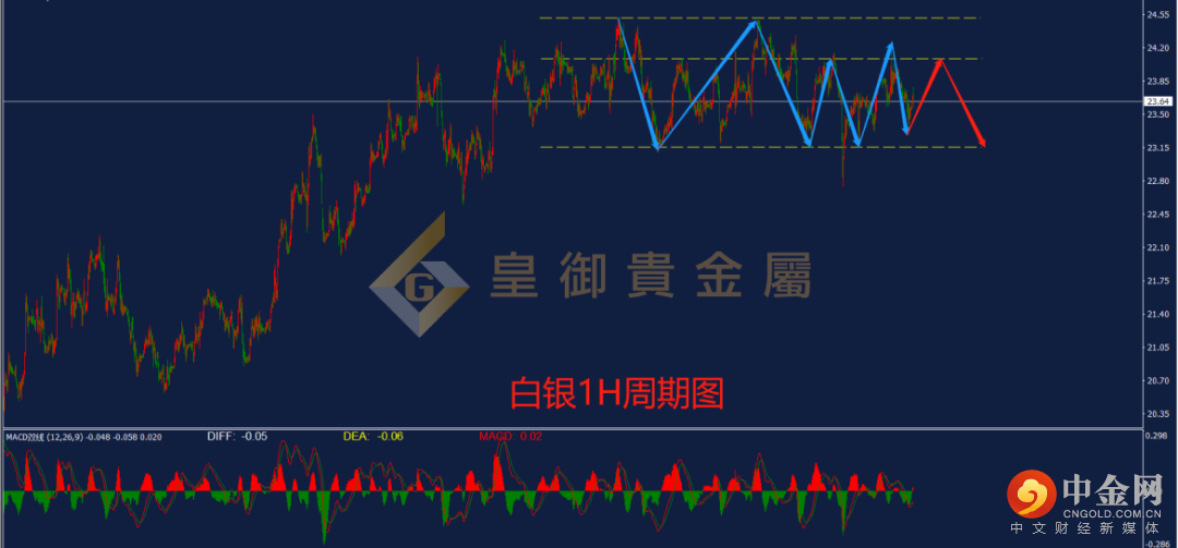 从下图的白银1H周期图来看,白银自此前进行上涨,向上触及关键压力位24.51附近后迎来调整,并构建高位箱体震荡区间,行情于区间内延续震荡,当前白银向下测试区间底部支撑附近后再次迎来向上的反弹。从指标上来看,MACD指标的多空动能均呈现缩量形态,DIFF与DEA双线于0轴上下穿插,预计行情后市大概率将延续震荡。日内操作建议以高抛低吸为主,当前可于上方关键压力位24.08一线布局空单。