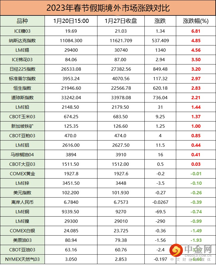 春节长假期间,全球股市上涨为主。商品方面,涨多跌少,原糖累涨近7%,伦锡上涨逾5%,而原油系品种出现不同程度下跌,美豆油累计跌幅达3.8%。