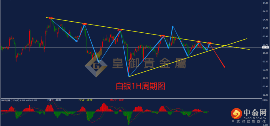 从下图的白银1H周期图来看,白银自此前向上触及24.50一线压力后迎来调整,当前走出高点逐渐下移,且低点逐渐抬高的震荡收敛形态,行情已运行至震荡结构末端。从指标上来看,MACD指标的多空动能均呈现缩量形态,DIFF与DEA双线运行于0轴附近,预计市场即将选择方向。日内建议等待行情突破当前震荡区间后进行入场,当前可等待行情下破下方关键支撑23.50一线后入场空单。