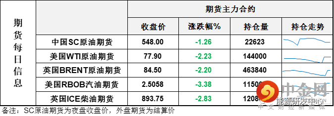 【1】WTI主力原油期货收跌1.78美元,跌幅2.23%,报77.9美元/桶;布伦特主力原油期货收跌1.9美元,跌幅2.2%,报84.5美元/桶;INE原油期货收跌1.26%,报548元。