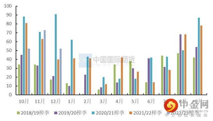 就2022年而言,由于国际原糖价格今年持续在17.5-21美分/磅运行,且原油价格高位运行抬升了海运费成本,因此我国2022年的食糖进口利润并不理想。截至2023月1月30日,南宁主产区的现货报价为5660元/吨,泰国糖配额内的加工成本已达到5336元/吨,巴西配额内的加工成本达5309元/吨。配额内内外糖之间的价差分别为324元/吨、351元/吨。泰国糖配额外的加工成本已达到6808元/吨,巴西配额外的加工成本达6772元/吨。配额外内外糖之间的价差分别为-1148元/吨、 -1112元/吨。后期需继续关注进口利润的变动情况,这将对进口糖节奏产生影响。
